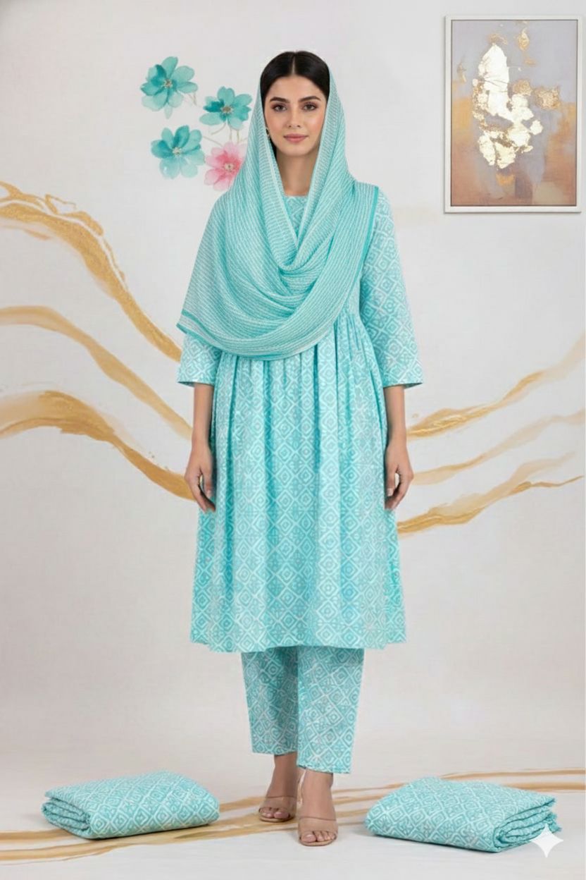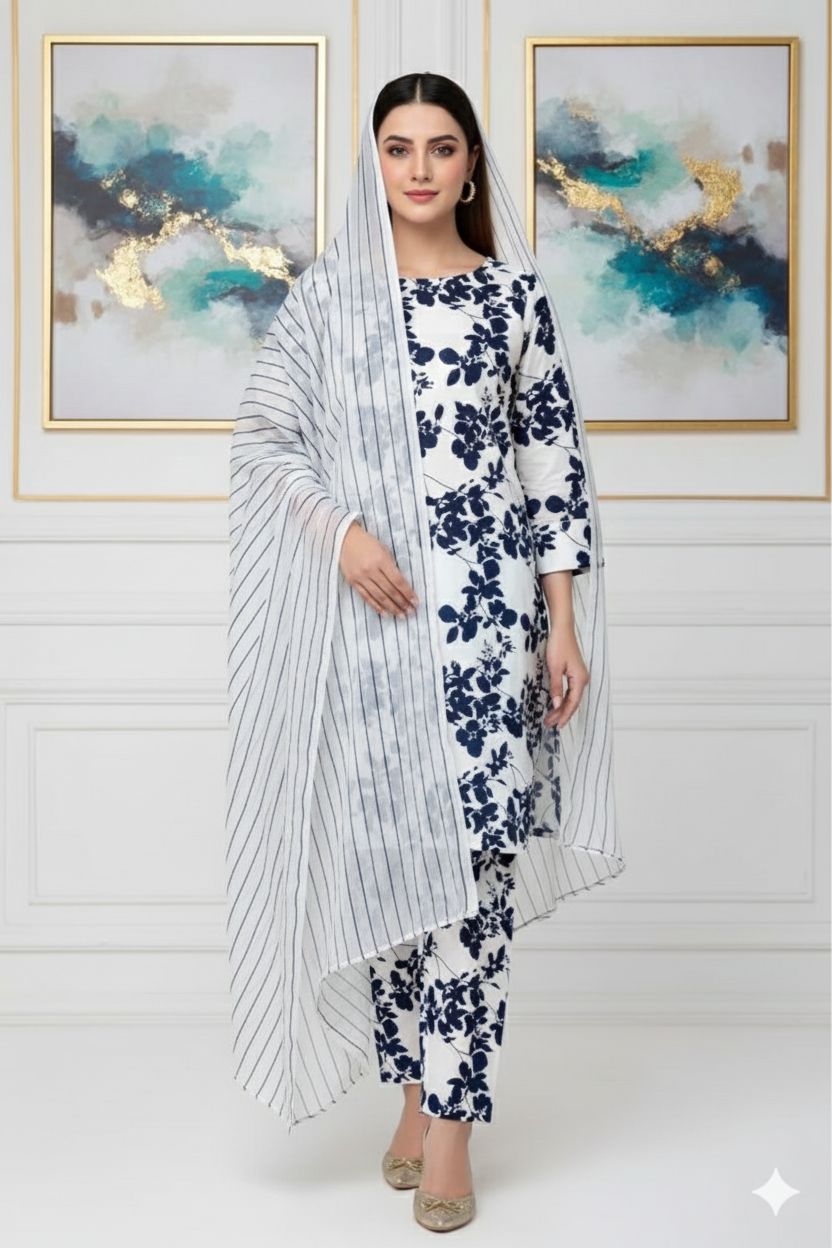 Basic 3 Piece Printed Light Khaddar Shirt: 3.02 MetersPlain Dupatta: 2.5 MetersLight Khaddar Trouser: 2.5...